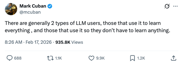 Last week, Mark Cuban posted this on X: "There are generally 2 types of LLM users, those that use it to learn everything, and those that use it so they don't have to learn anything."
