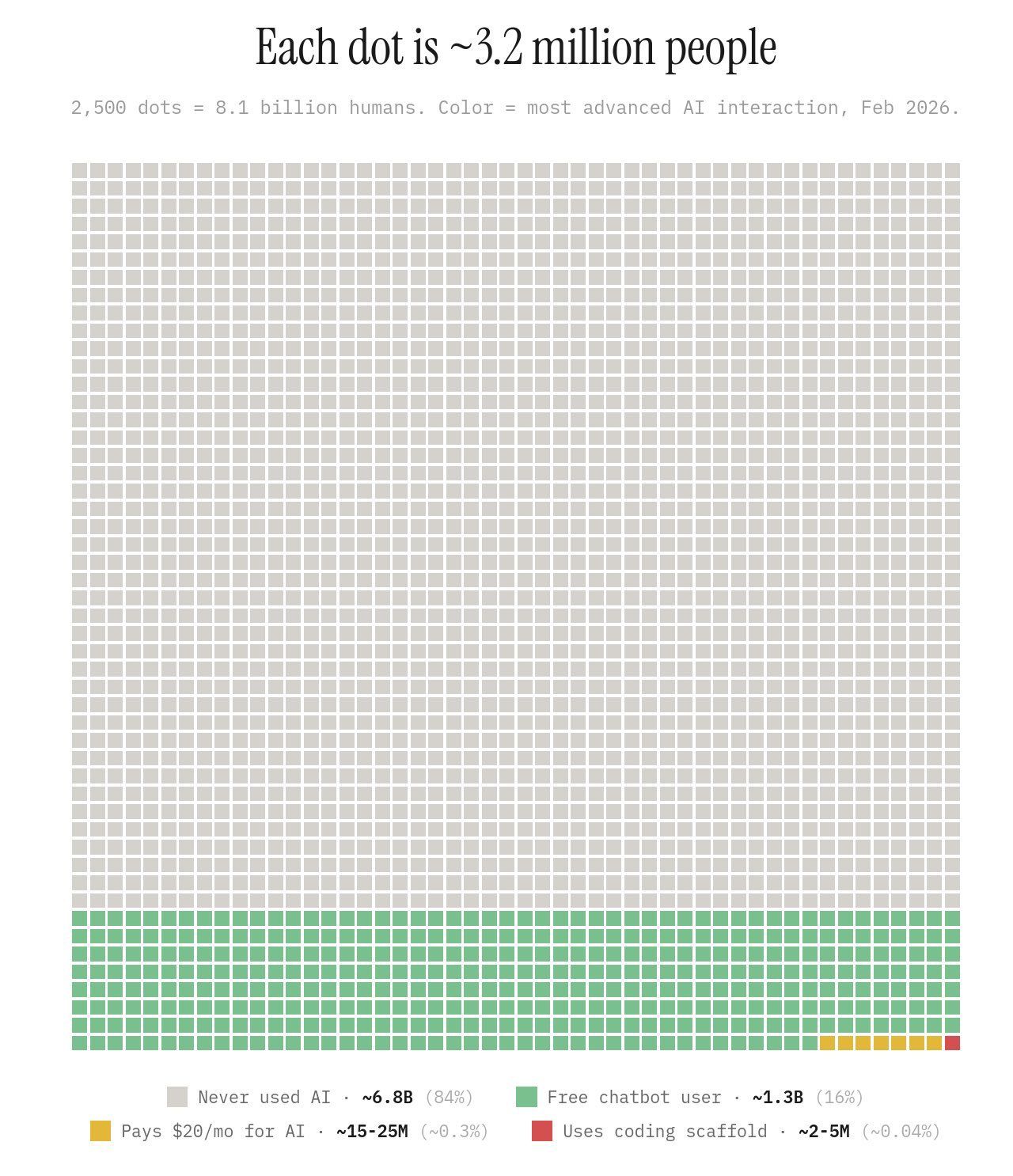 A chart went viral on X over the weekend. 2,500 dots, each one representing about 3.2 million people. The whole thing adds up to 8.1 billion humans, color-coded by the most advanced AI interaction they've ever had.