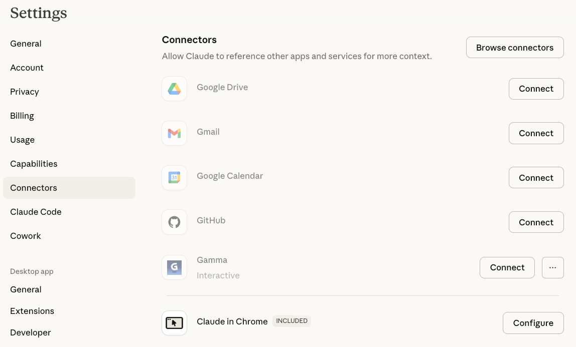 For most knowledge workers the highest-value connections are Gmail, Google Drive or Notion, and your calendar. Each one represents a step-change in what the model can do for you. The more context it has, the less you have to explain, and the better the output gets. You don't need to connect everything at once. But you might want to.