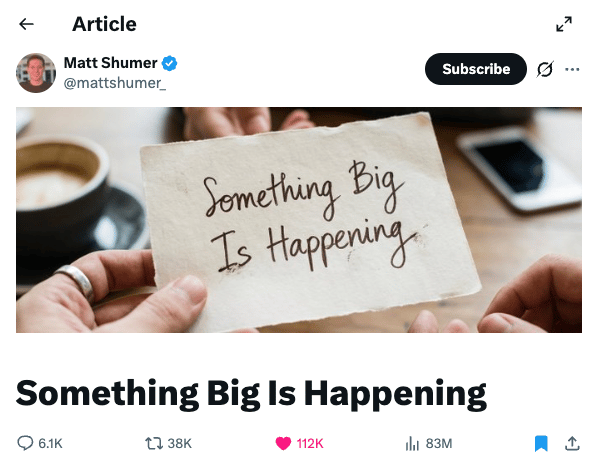 "Something Big Is Happening" took over the internet this week. Matt Shumer's viral essay comparing this moment in AI to February 2020 hit 80+ million views. Will Manidis quickly responded with "Tool Shaped Objects," a sharp critique of AI hype that produces nothing but the feeling of productivity. The Information's Abram Brown summarized the whole thing in "AI Industry's Big Flaw: No One Speaks Normie." His point: everyone is talking past each other and freaking out. 80 million views, and the tech industry still can't explain AI to normal people. Which is, incidentally, what this newsletter is for.